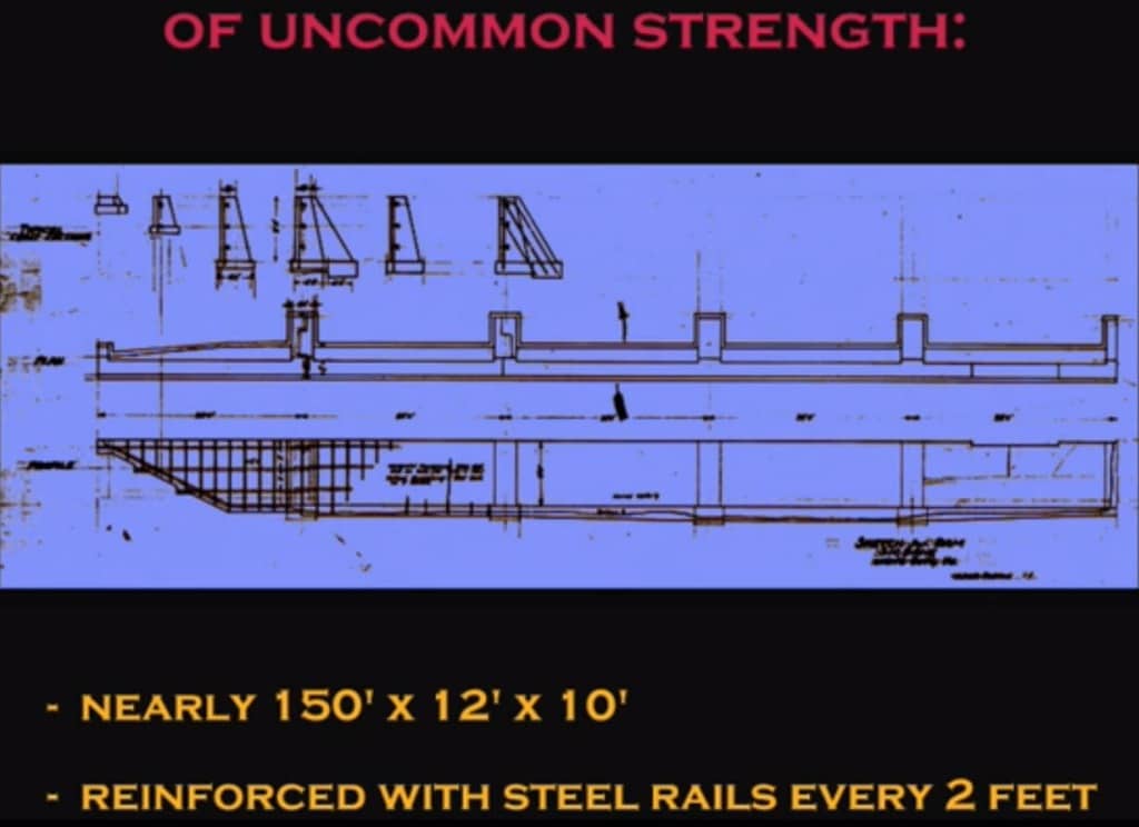 Andrews’ design enabled workers to exert enough control over water flow that these steps would remain dry; workers could cross the dam on foot to operate the floodgates along its length without getting their feet wet. Between these steps, the height of the over-topping water was allowed to fluctuate no more than the two inches between the top surface of the steps and the top of the dam.