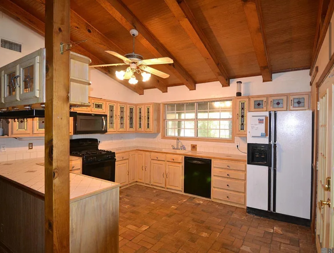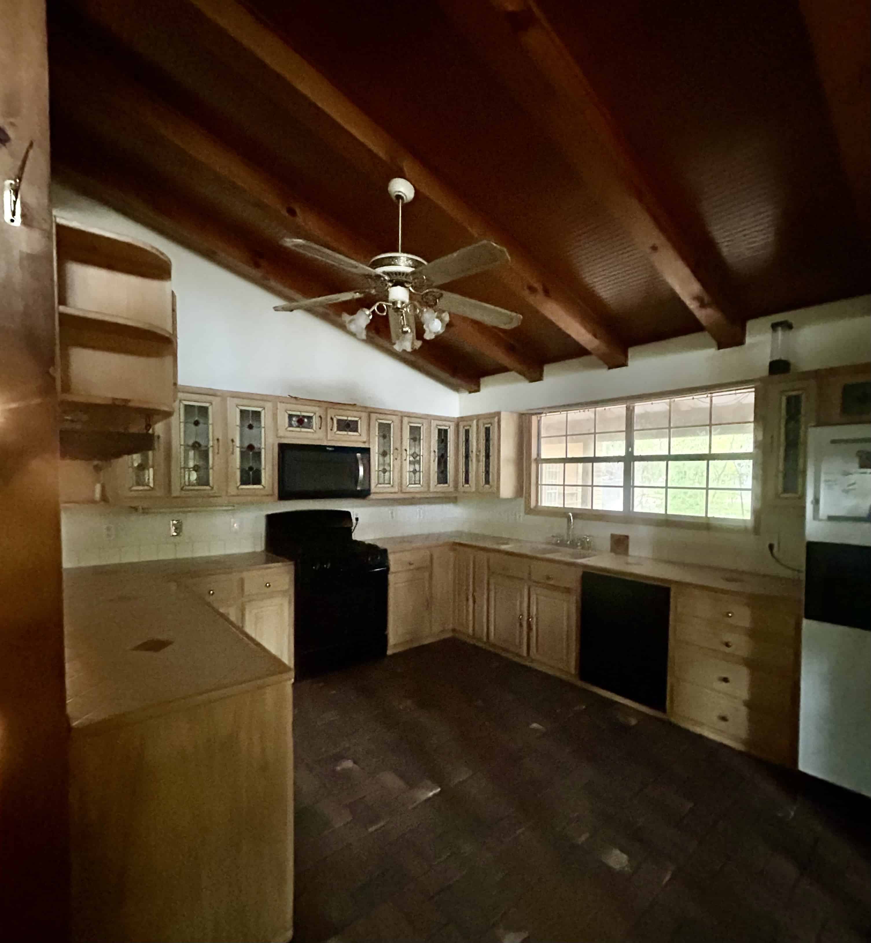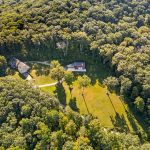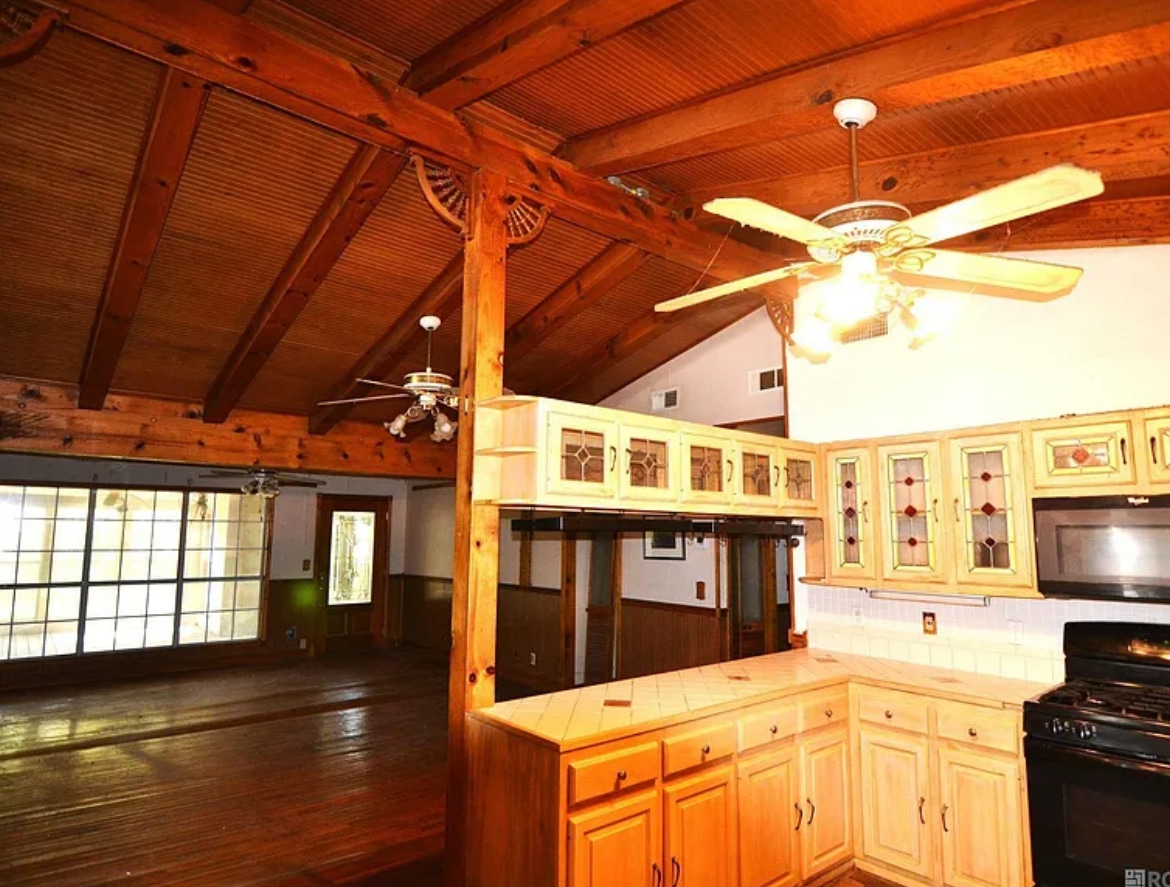 Inside the unfinished home, which has blown foam insulation to help with climate control, the primary bedroom has an ensuite bath, while the open concept kitchen/dining/living area features stained glass cabinetry, vaulted ceiling, exposed beams, a glass gable letting in light and treetop views, and French doors leading to a partially screened wraparound porch… perfect for reading or entertaining.