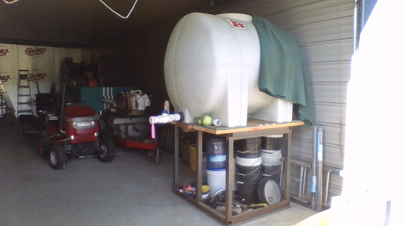 Roof runoff fills 800-gallon cistern tanks (gravity or pump-fed)