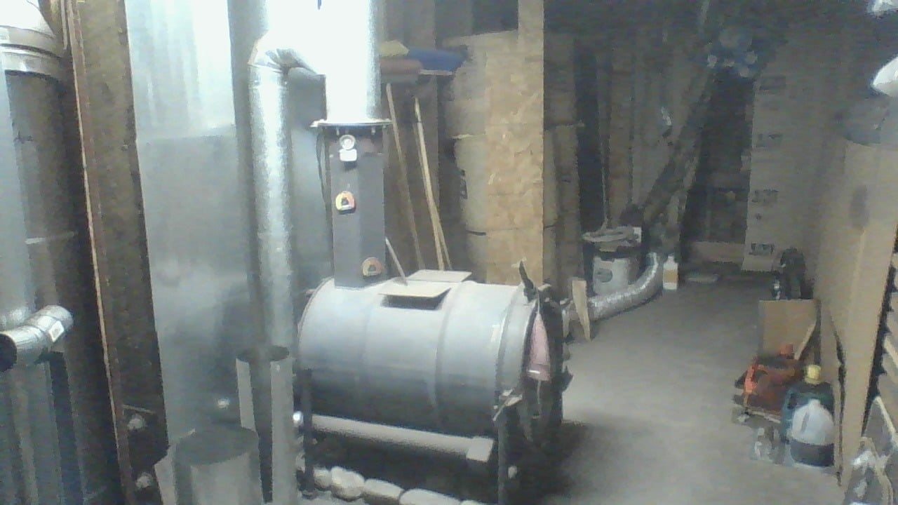 High-efficiency wood heat with 5 winters of split firewood stacked inside